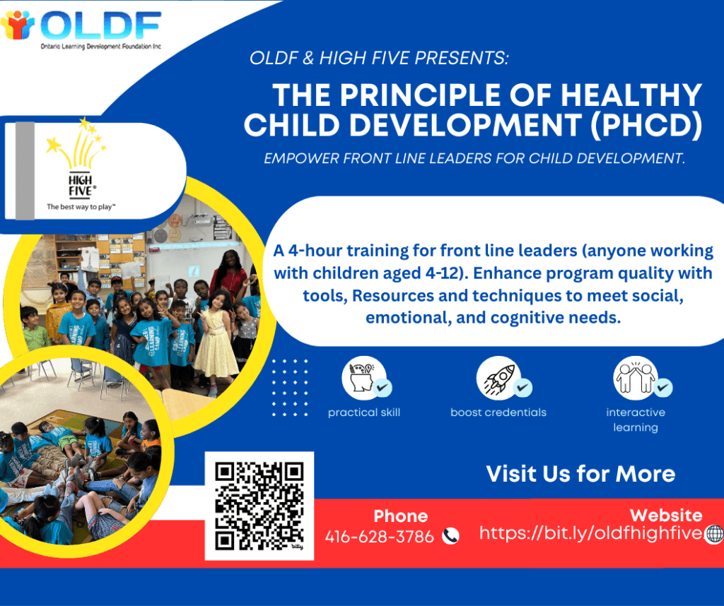 The Principles of Healthy Child Development (PHCD) is a 4-hour training that equips front-line leaders (anyone working with children aged 4 to 12) with the tools to immediately enhance the quality of their programs. The training provides valuable information, resources, and techniques to ensure that each child’s social, emotional, and cognitive needs are met. Additional Information: This training is only open to residents of Ontario. Once registered, training is not refundable and non-transferable. This training requires 100% attendance and participation. You will need the following for the training: 1. Stable internet connection 2. Webcam 3. Microphone Please log in 15 minutes prior to the start of training to test: Your internet connection, audio settings, and camera settings. If you have any questions, kindly contact us at info@oldf.org or 4166283786 **You can also buy a gift card as a gift and get them to register https://squareup.com/gift/NCA57AG98B112/order *If the class you want is full, kindly email us at info@oldf.org or call us at 416-628-3786, as we have other class dates. Register Here